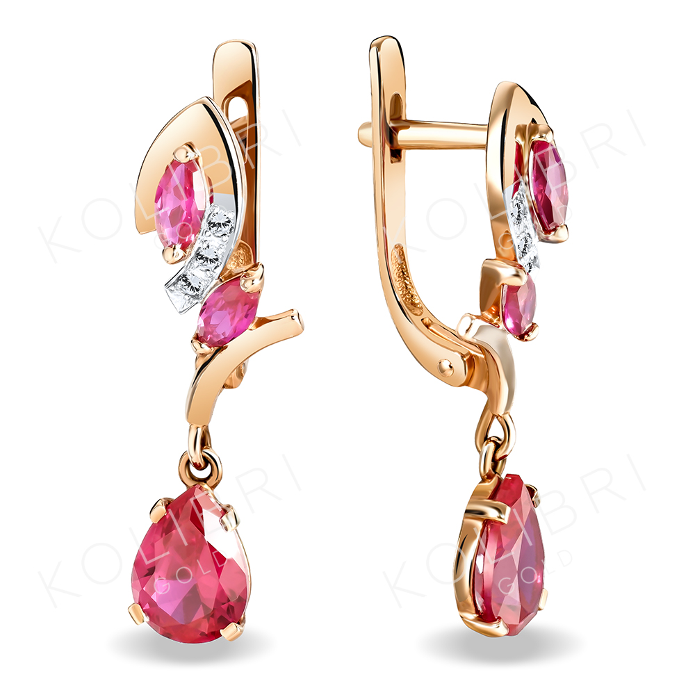 Золотые серьги с рубиновым корундом и фианитом ЗОЛОТОЙ КРИСТАЛЛ ОС-580_КОРР