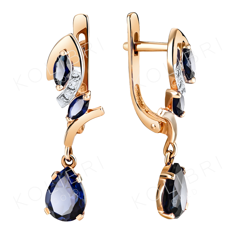 Золотые серьги с сапфиром гидротермальным и фианитом ЗОЛОТОЙ КРИСТАЛЛ ОС-580_КОРС